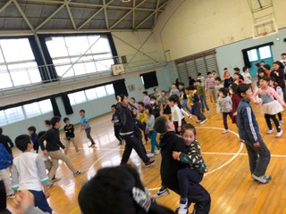 2年生と6年生は体育館で猛獣狩りゲーム。初めは学年だけだったのですが、段々と入り混じり、最後は2つの学年が合同で行いました。6年生から2年生を誘う場面もあれば、2年生から6年生に声をかける場面もありました。