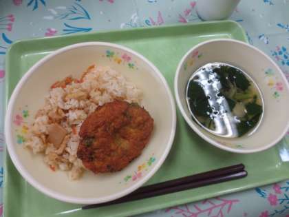 今日の献立は「たけのこごはん」「豆腐のまさご揚げ」「くずきりのすまし汁」「牛乳」です。