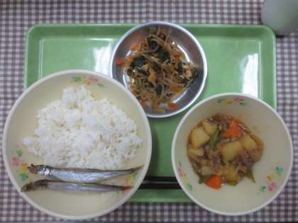 今日の献立は「ごはん」「焼きししゃも」「じゃがいものそぼろ煮」「小松菜と揚げの煮びたし」「牛乳」です。