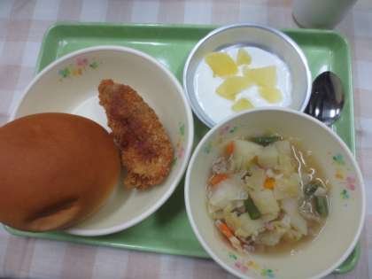 今日の献立は「フィッシュサンド」「野菜のスープ煮」「りんごヨーグルト」「牛乳」です。