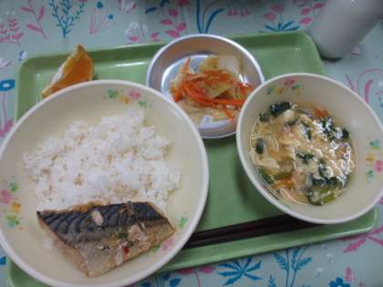 今日は、主食(ごはん)、主菜(さばの辛みそ焼き)、副菜(香りキャベツ)、乳製品(牛乳)、果物(デコポン)がそろった給食を提供しました。