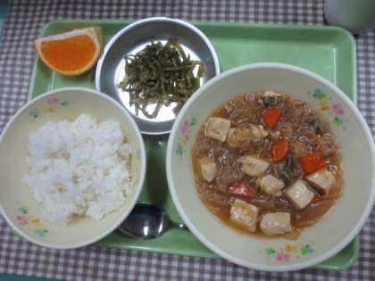 今日の献立は「ごはん」「肉豆腐」「茎わかめのじゃこ炒め」「清美オレンジ」「牛乳」でした。