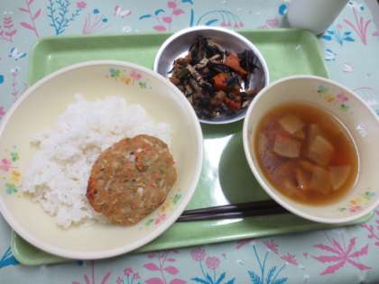 今日の献立は「ごはん」「あじのさんが焼き」「根菜汁」「牛乳」です。