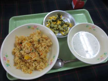 今日の献立は「メキシカンライス」「じゃがいものポタージュ」「コロコロ豆サラダ」「リンゴジュース」です。
