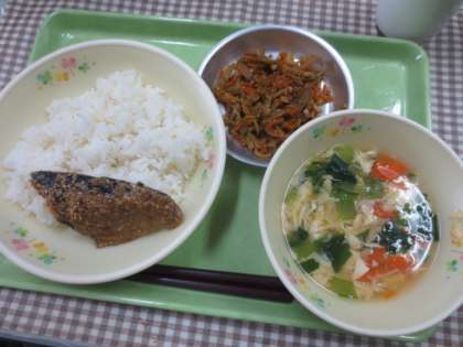 今日の献立は「ごはん」「さばのごまみそ煮」「かきたまじる」「五目きんぴら」「牛乳」です。