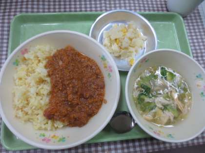 今日の献立は「チリビーンズライス」「レタスと卵のスープ」「コーンポテト」「牛乳」です。