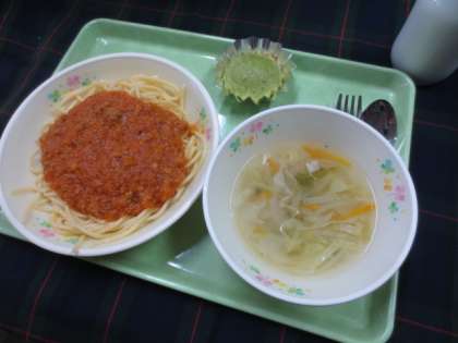 今日の献立は「スパゲティミートソース」「ジュリエンヌスープ」「桑の葉ミニマドレーヌ」「牛乳」です。
