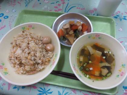 今日の献立は「ししじゅうし」「根菜の煮物」「うずら卵のしょうゆ煮」「ゆばとわかめのすまし汁」「牛乳」です。「ししじゅうし」は、沖縄の郷土料理のかやくご飯です。豚肉やきざみ昆布のうまみ成分が合わさって、とてもおいしいご飯です!