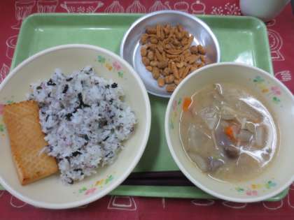 今日の献立は「かみかみごはん」「いかの香味焼き」「具だくさんきのこ汁」「ナッツ豆黒糖」「牛乳」です。