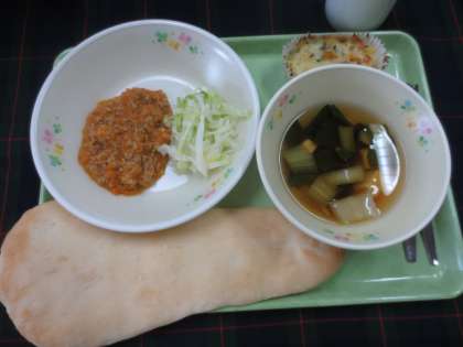 今日の献立は「ナン」「タコス」「ジャーマンポテト」「チンゲン菜のスープ」「牛乳」です。