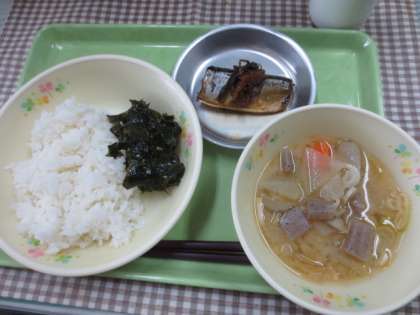 今日の献立は「ごはん」「さんまの梅煮」「いなか汁」「わかめのにんにく炒め」「牛乳」です。