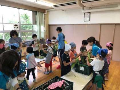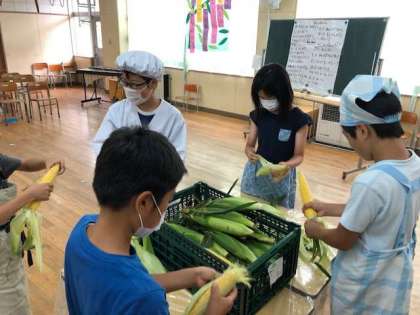 栄養士さん、講師の方々の協力のもと、今年もみどりでトウモロコシの皮むきをしました。