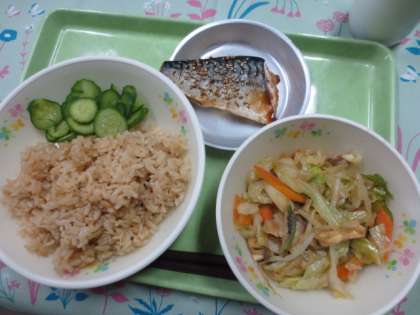 今日の献立は「八王子しょうがごはん」「さばのごま風味焼き」「野菜のみそ炒め」「きゅうりの塩漬け」「牛乳」です。