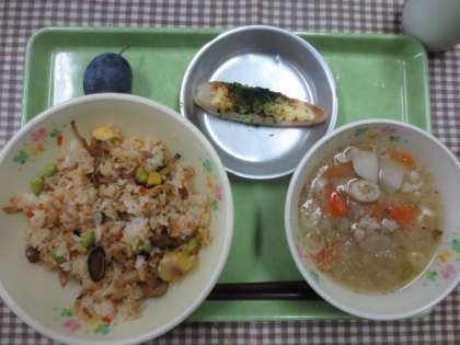 今日の献立は「秋の彩りごはん」「笹かまぼこのマヨネーズ焼き」「根菜ごま汁」「プルーン」「牛乳」です。