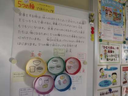 9月は、給食掲示板に「バランスよく食べよう」をテーマに、5つの輪(主食、主菜、副菜、乳製品、果物)の紹介ポスターを掲示しました。