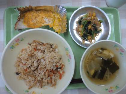 今日は八王子市の和み献立です。内容は「かてめし」「魚の夕焼小焼やき」「桑の葉だんご汁」「野菜のおかか和え」「牛乳」です。
