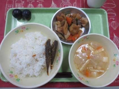 今日の献立は「ごはん」「豆アジの南蛮漬け」「筑前煮」「呉汁」「巨峰」「牛乳」です。