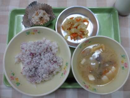 今日の献立は「梅ごはん」「いが蒸し」「味噌けんちん」「香りキャベツ」「牛乳」です。