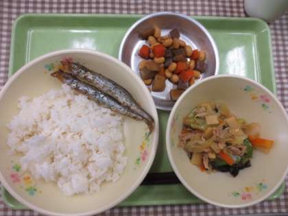 今日の献立は「ごはん」「ししゃもの磯辺焼き」「野菜炒め」「五目煮豆」「牛乳」です。