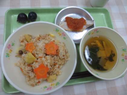 今日の献立は「吹き寄せおこわ」「さわらの紅葉おろしソース」「青菜のすまし汁」「巨峰」「牛乳」です。