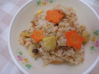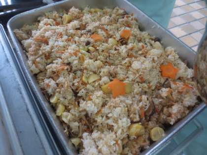 今日の吹き寄せおこわには、細切りした人参に加えて、花型の人参をいくつか混ぜて提供しました。栗やきのこが入った秋らしいおこわを美味しくいただきました。