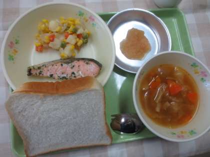 今日の献立は「手作りりんごジャムサンド」「鮭のオリーブ焼き」「ベジタブルソテー」「白いんげん豆とトマトのスープ」「牛乳」です。
