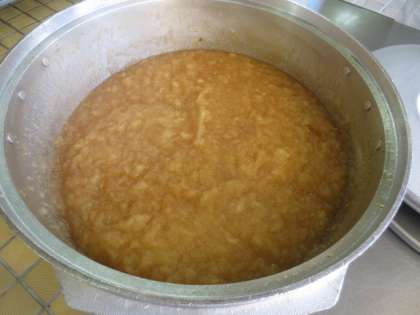 今日のりんごジャムは、給食室でカットしたりんごに砂糖とレモン汁を混ぜて、煮詰めて作りました。りんごはすりおろさずに角切りにして煮ているため、少し形が残ったジャムになりました。