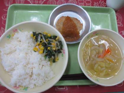 今日の献立は「ごはん」「豆腐ハンバーグのおろしたれ」「ほうれん草のソテー」「白菜スープ」「牛乳」です。