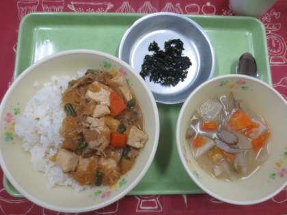今日の献立は「ごはん」「肉豆腐」「根菜汁」「わかめのにんにく炒め」「牛乳」です。