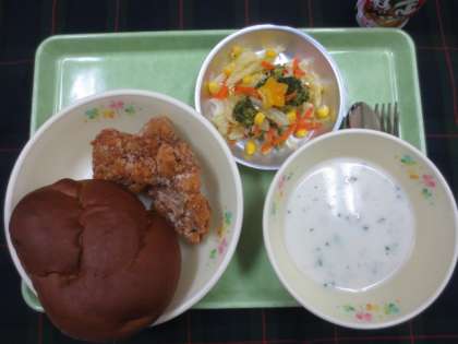 今日の献立は「ココアパン」「鶏のから揚げ」「キャロットサラダ」「じゃがいものポタージュ」「ジョア」です。