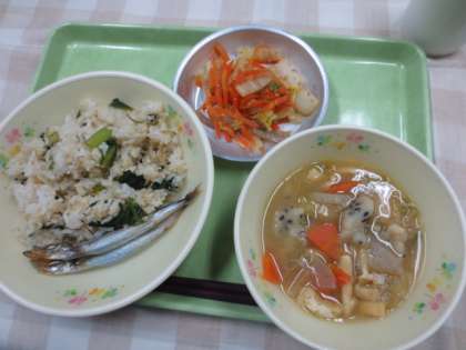 今日の献立は「菜っぱ飯」「じゃがいもすいとん」「焼きししゃも」「白菜のごまあえ」「牛乳」です。