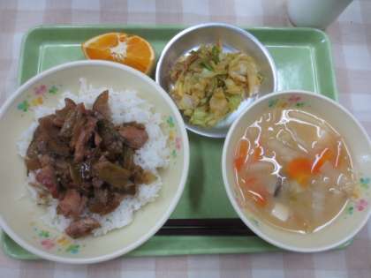 今日の献立は「焼き鳥丼」「たら汁」「香りキャベツ」「ネーブル」「牛乳」です。
