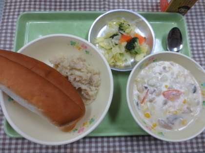 今日の献立は「マッシュサンド」「クリームシチュー」「フレンチサラダ」「みかんジュース」です。