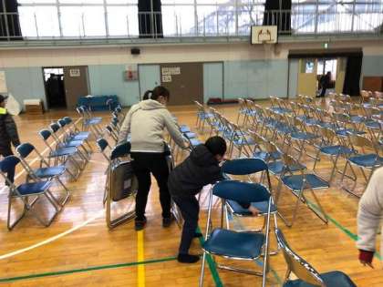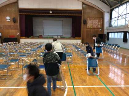 小中一貫教育の後、体育館の会場準備を率先して手伝う5年生。