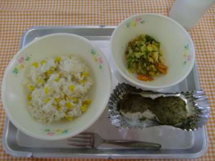 コーンライス、白身魚のマヨネーズ焼き、温野菜のゴマソース、牛乳