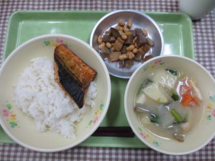 今日の献立は「ごはん」「さばのカレー焼き」「五目煮豆」「とり汁」「牛乳」です。