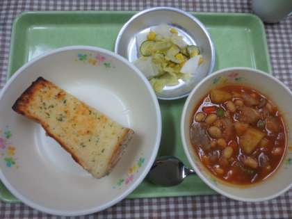 今日の献立は「ガーリックトースト」「ポークビーンズ」「冬キャベツと大根サラダ」「牛乳」です。