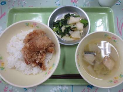 今日の献立は、だしで味わう和食献立です。内容は「ごはん」「鶏のだし唐揚げ」「船場汁」「かぶらと青菜のおひたし」「牛乳」です。