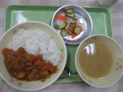 今日の献立は「チキンカレー」「野菜のピクルス」「オニオンスープ」「牛乳」です。