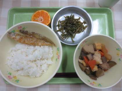 今日の献立は「ごはん」「わかさぎ甘酢」「根菜のうま煮」「茎わかめのしょうが炒め」「ぽんかん」「牛乳」です。