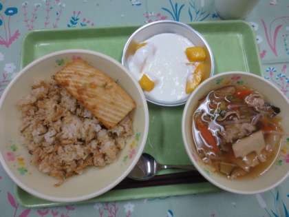 今日の献立は「ししじゅうし」「いかの香味焼き」「ワンタンスープ」「ピーチヨーグルト」「牛乳」です。