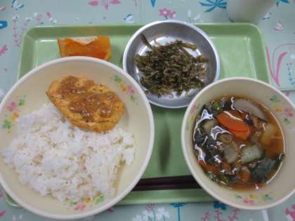 今日の献立は「ごはん」「豆腐の田楽風焼き」「根菜汁」「茎わかめのじゃこ炒め」「みかん(せとか)」「牛乳」です。