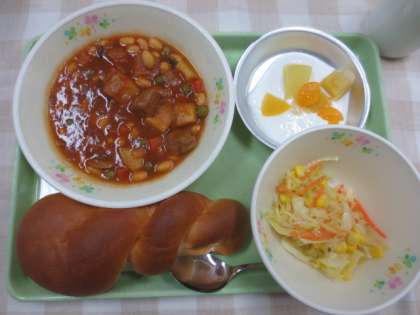 今日の献立は「ミルクパン」「ポークビーンズ」「コールスロー」「フルーツヨーグルト」「牛乳」です。