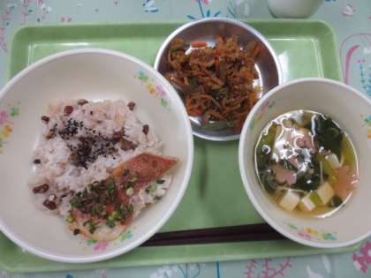 今日は、入学・進級お祝い献立を提供しました。内容は「赤飯」「赤魚の西京焼き」「ポテトきんぴら」「春のお吸い物」「牛乳」です。