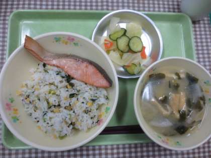 今日の献立は「菜の花ごはん」「鮭の照り焼き」「さつまいもの味噌汁」「浅漬け」「牛乳」です。