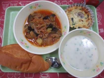 今日の献立は「ソフトフランスパン」「ほうれん草のキッシュ」「ラタトゥイユ」「じゃがいものポタージュ」「りんごジュース」です。