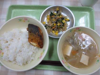 今日の献立は「ごはん」「さばのカレー焼き」「野菜とじゃこの炒め物」「田舎汁」「牛乳」です。