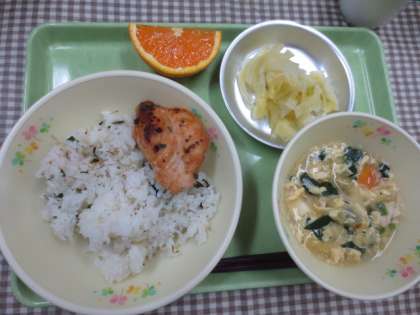 今日の献立は「梅じゃこごはん」「鶏肉のみそ焼き」「かきたま汁」「キャベツのはちみつレモン風味あえ」「清見オレンジ」「牛乳」です。