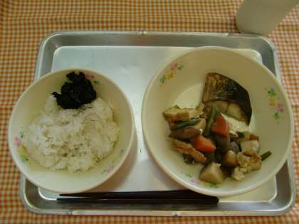 麦ご飯、焼き魚、野菜のうま煮、のりとしいたけの佃煮、牛乳