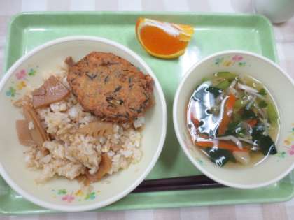 今日の献立は「たけのこごはん」「豆腐のまさご揚げ」「くずきりのすまし汁」「デコポン」「牛乳」です。